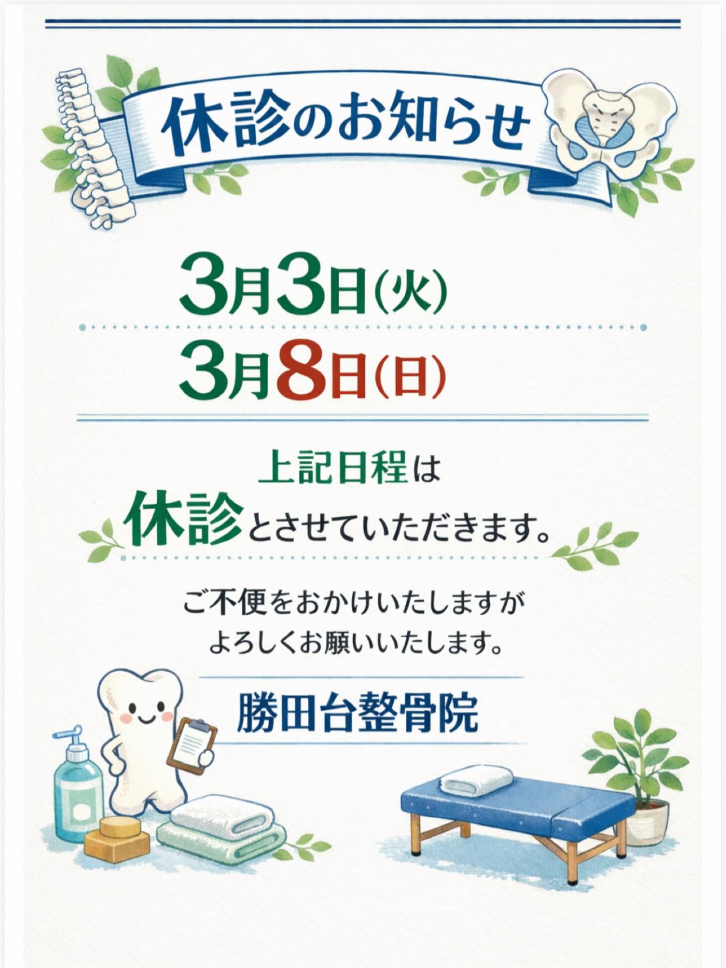 3月3日(火)、8日(日)は休診とさせていただきます。 ご迷惑をお掛け致しますがご了承下さい。 #勝田台整骨院#八千代市整骨院 #佐倉市整骨院  #美容鍼 #肩こり 腰痛 交通事故整骨院