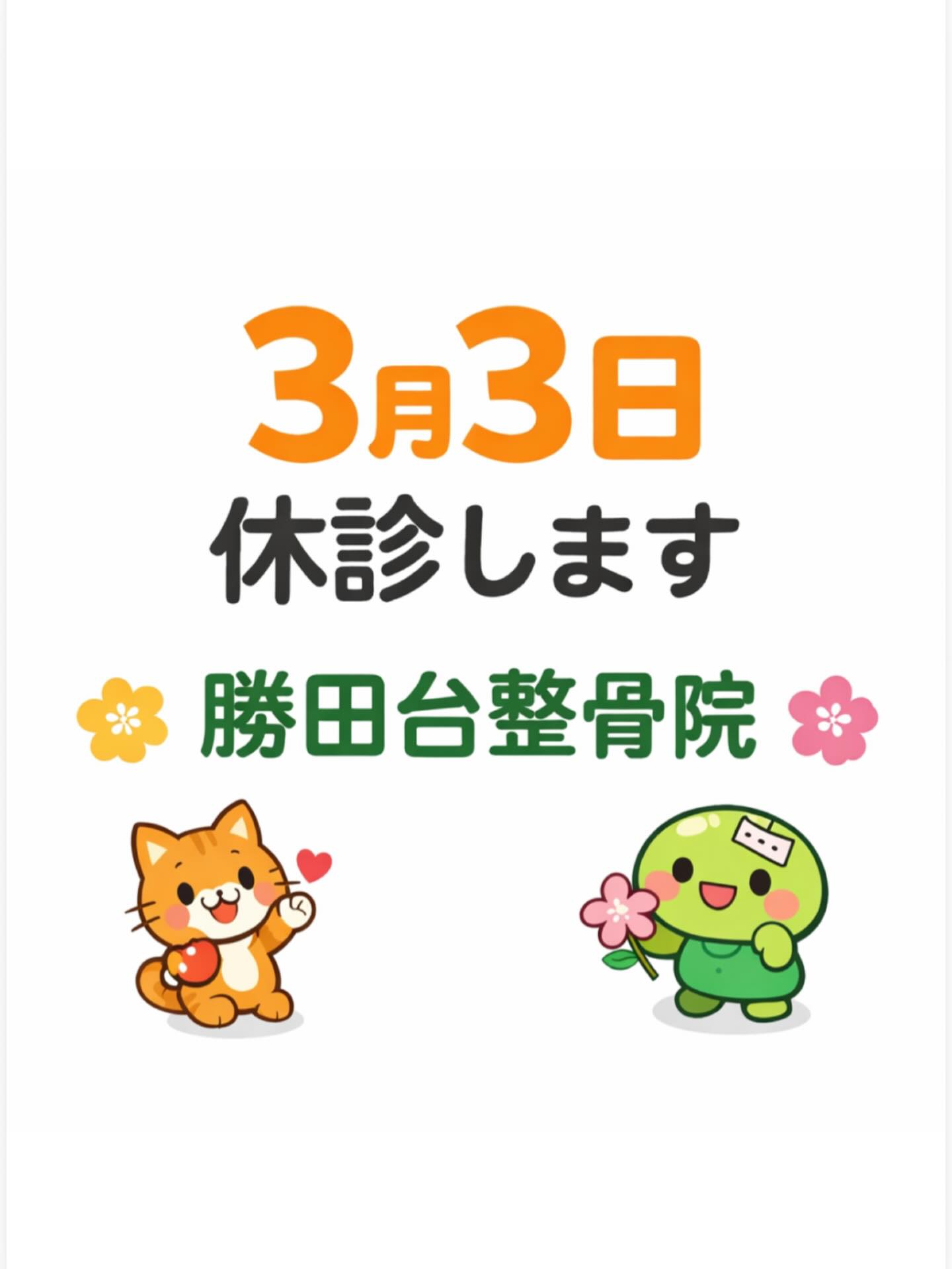 3月3日は休診となります。 ご迷惑をお掛けしますがご了承下さい。 #勝田台整骨院#八千代市整骨院 #佐倉市整骨院 #整骨院 #美容鍼 肩こり 腰痛 交通事故